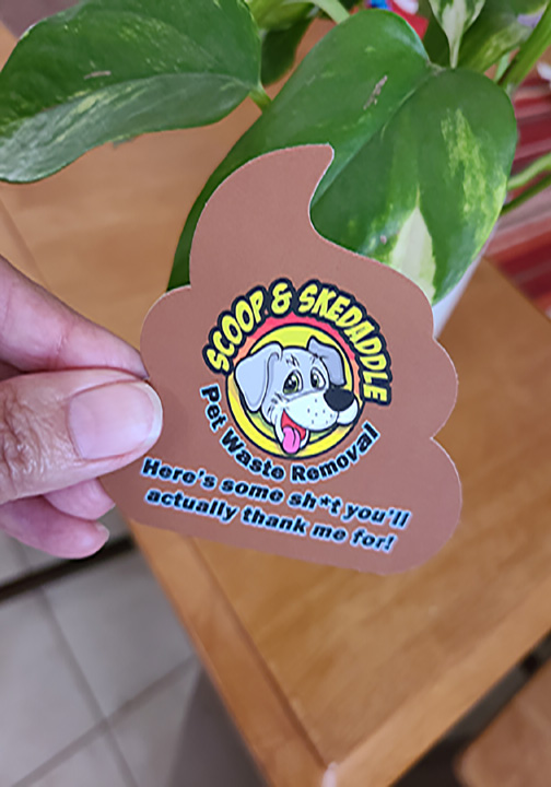 Did you know that designs custom-shaped business cards? Recently, we fulfilled a specific request from a client who wanted a business card shaped like a “poop emoji.” Our client operates a pet waste removal service…