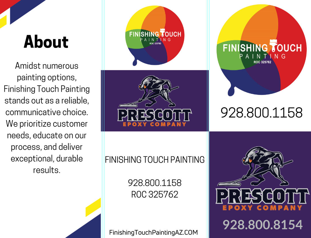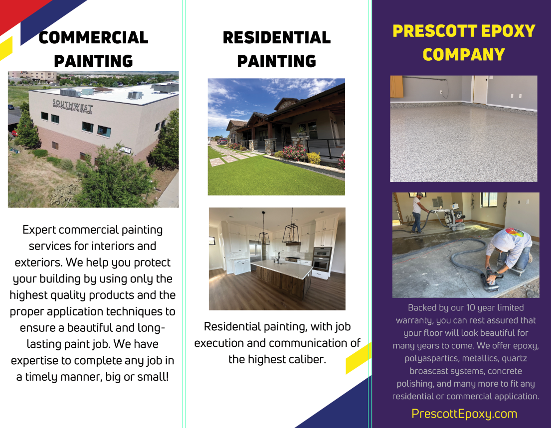 *** Prescott Epoxy requested Sparrow Printing to setup their already created brochures for printing. I worked with their designer to make some corrections in order to make the brochure look even better, while lining up correctly and setting up for high resolution printing.