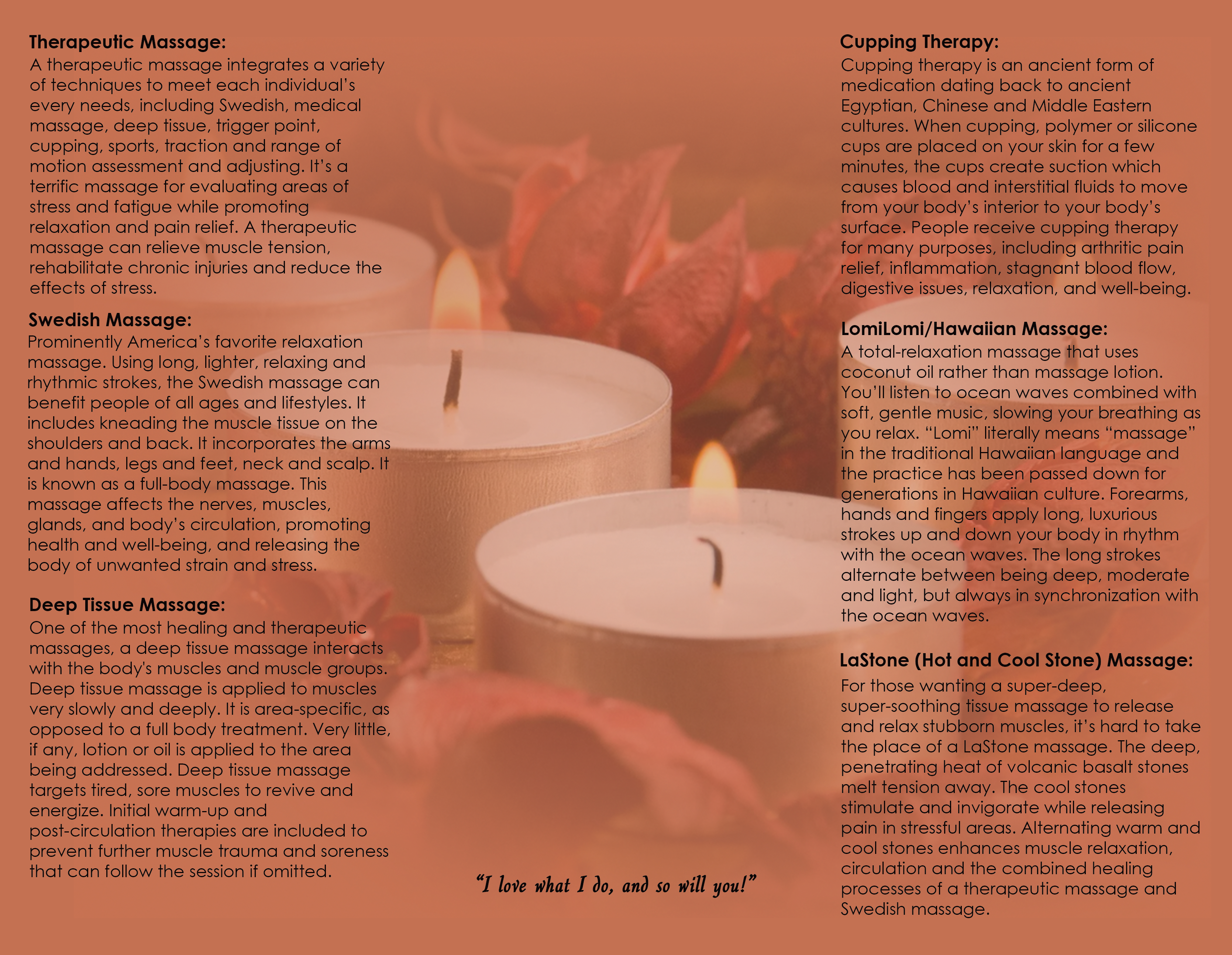 *** Sparrow Printing graphic designed Massage by Sandi tri-fold brochures from scratch. This was setup for printing process once it was approved.