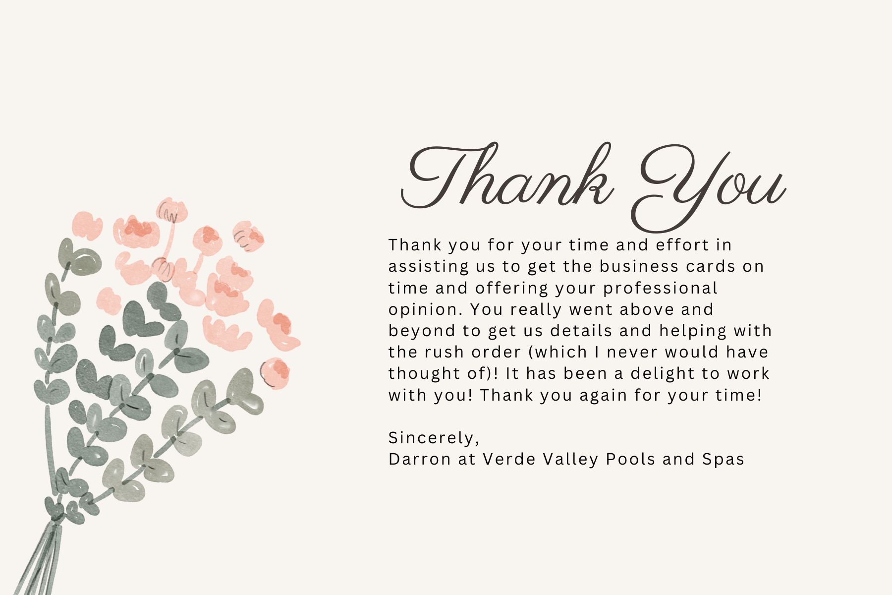“Iva was incredibly helpful in getting our business card order delivered on time. She went above and beyond to make sure our deadline was met, keeping us informed every step of the way with the ordering process. She was a pleasure to work with and made the process smooth and enjoyable. Thank you so very much for your time and effort in our order!” ~ Darron Murphy owner of Verde Valley Pools & Spas